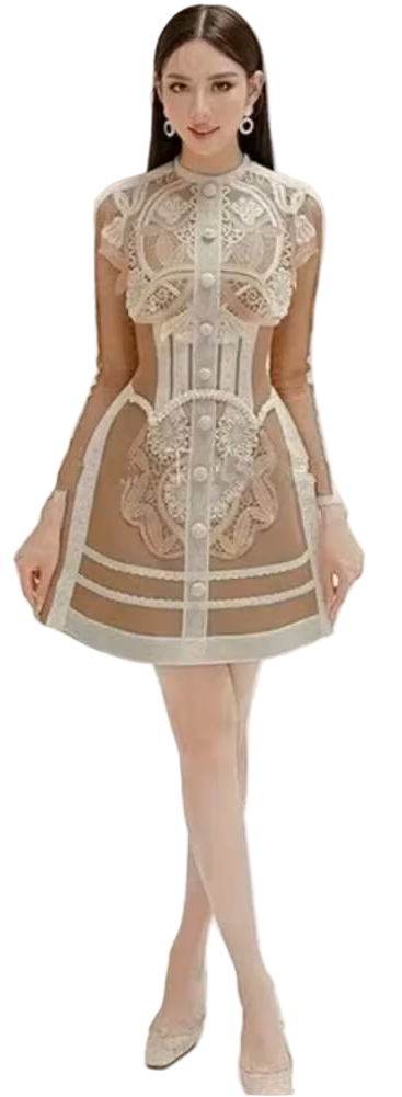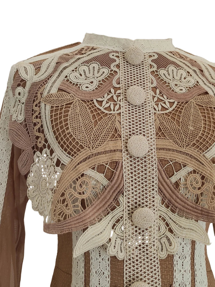 The Selma Toffee Dress combines sophisticated tailoring with texturing. This A-line mini dress features a classic collar and button-through sheer sleeves. Rendered in warm embroidered tones of toffee, coffee and cream, the intricate detailing elevates the piece from everyday wear to occasion-ready. The structured A-line cut flatters multiple body types while the sheer sleeves provide subtle transparency and movement. This dress perfecty transitions from day to evening wear with minimal styling effort.